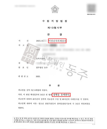 [아동청소년 위계등간음] 집행유예 - 1심에서 실형선고 되었지만 동주에서 항소진행, 집행유예 성공한 사례